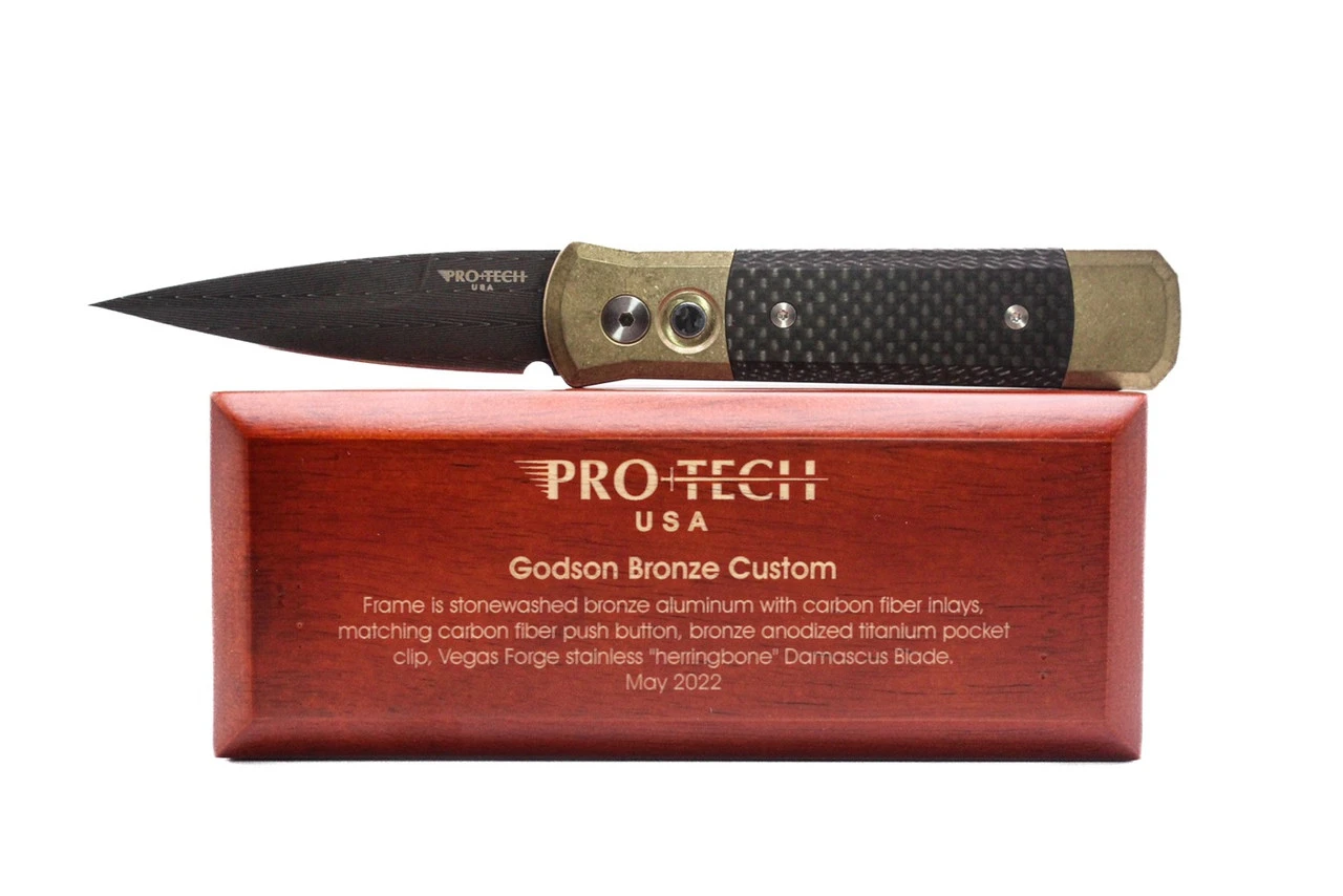 Godson Bronze AL Handle Carbon Fiber Inlays CF Push Button Vegas Forge Herringbone DamascusÂ